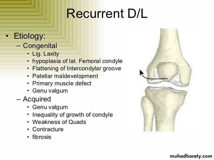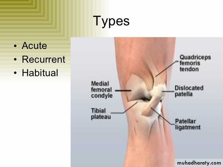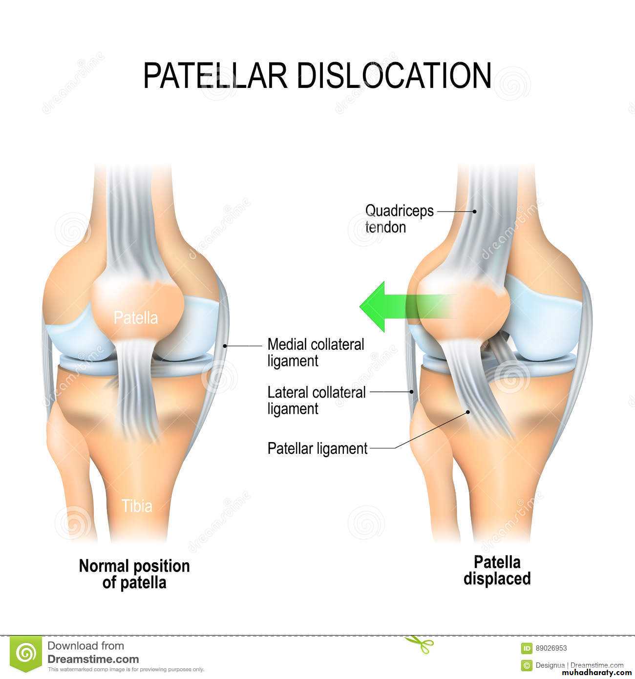• Traumatic dislocation of patella occurs when it's subjected to direct lateral violence with the knee flexed, this leads to either subluxation with the patella over-riding the lateral femoral condyle (usually it slips back) or it's completely dislocated laterally.This injury is usually associated with damage to the medial side of extensor expansion and haemarthosis•
