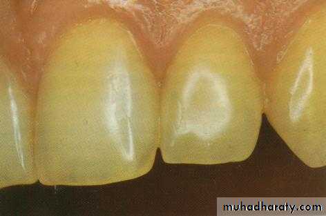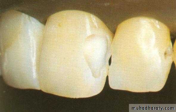 after acid etching result withmicroscopic under cut.(5-50micron depth). Clinically if the enamel have been properly etched is described as having a ground glass or chalky white in color, this indicate successful etching . the more commercial enamel etching are (30- 40 %) concentration of phosphoric acid solution or gel mostly (37%) and applied for 1 min.