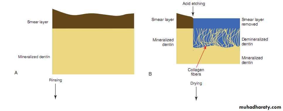 • Use of conditioner/etchant causes removal or modification of the smear layer, demineralizes peritubular and intertubular dentin and exposes collagen fibrils