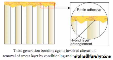 • Mechanism of bonding: The fourth “generation” is characterized by the process of hybridization at the interface of the dentin and the composite resin.• Hybridization is the phenomenon of replacement of the hydroxyapatite and water at the dentin surface by resin. This resin, in combination with the collagen fibers, forms a hybrid layer.
