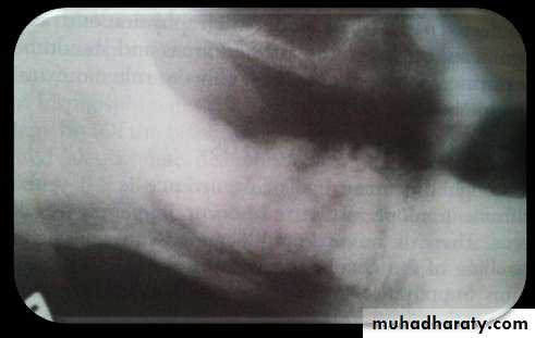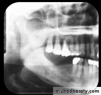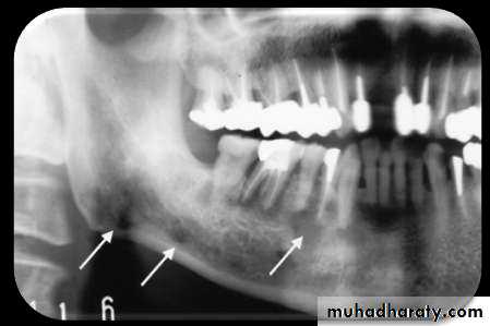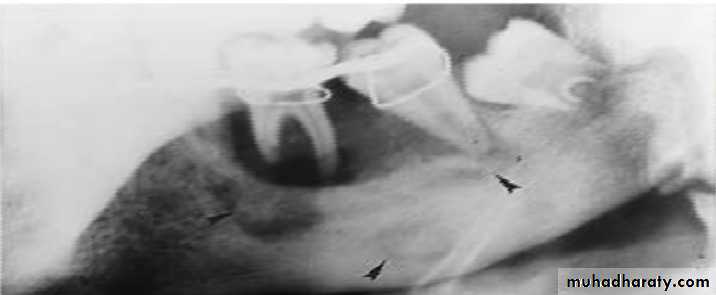 • May be normal in early stages of disease . Do not appear until after at least 10 days.• Radiograph may demonstrate ill-defined radiolucency.