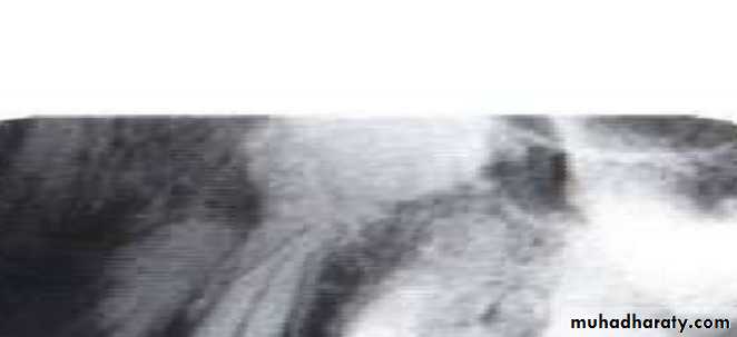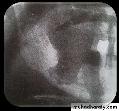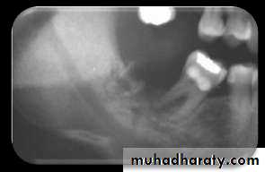 • Patchy, ragged & ill defined radiolucency. Often contains radiopaque sequestra.• Sequestra lying close to the peripheral sclerosis & lower border.