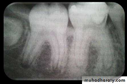 • Increased areas of radiodensity surrounding apices of nonvital mandibular first molar• MANAGEMENT