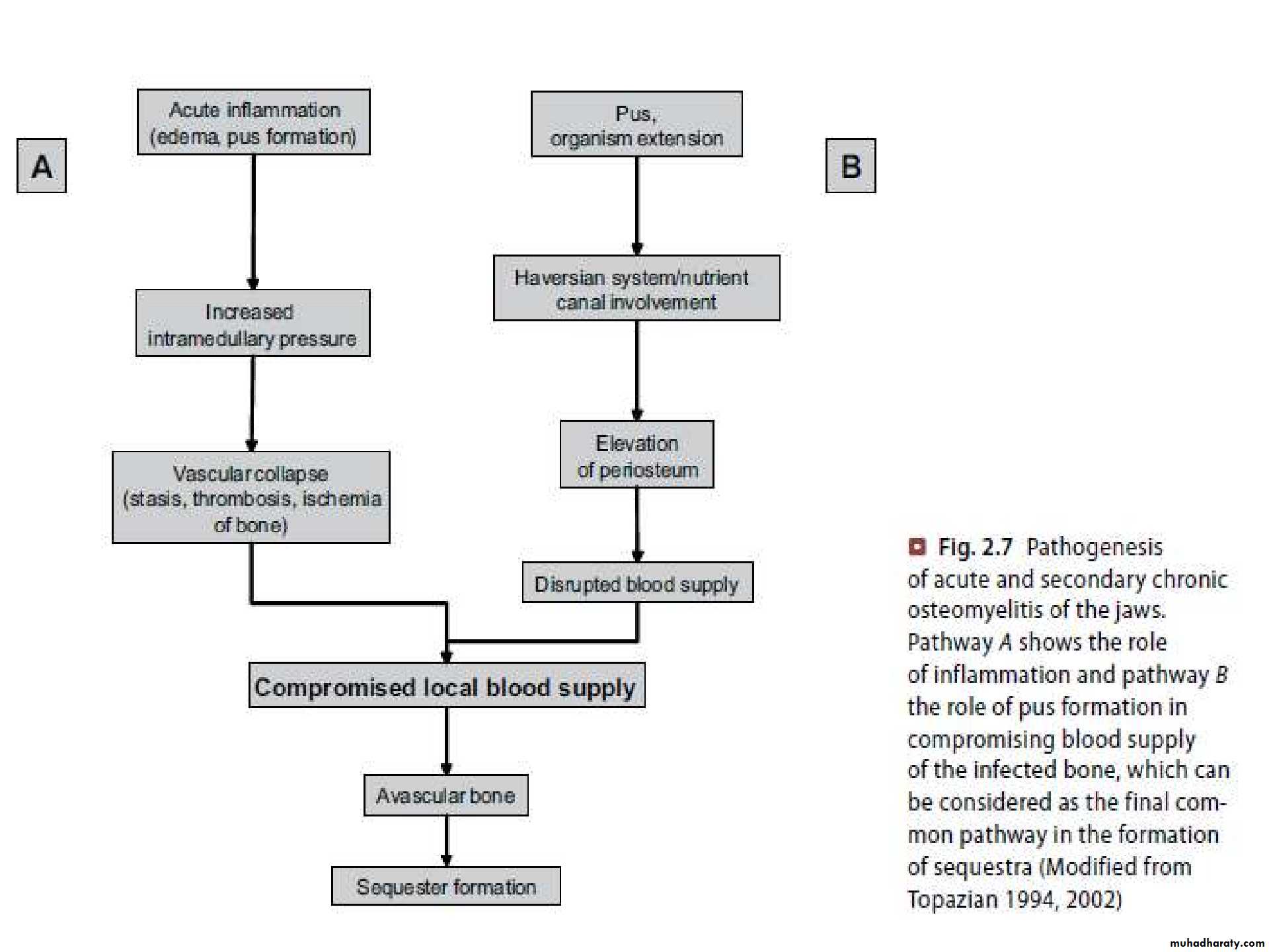 • Organisms entry into the jaw, mostly mandible, compromising the vascular supply• Medullary infection spreads through marrow spaces