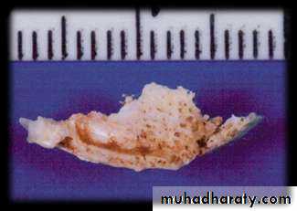 • Submitted material for biopsy predominantly consists of necrotic bone & is diagnosed as sequestrum• Bone shows:
