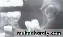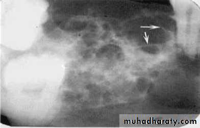 • Larger and less numerous loculations due to breakdown of honeycomb pattern eg.ameloblastoma.• D:Tennis Racket Pattern
