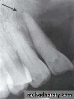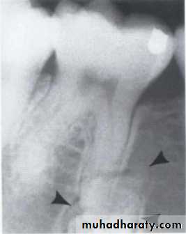 Blending border. A gradual transition from the dense trabecular of sclerosing osteitis (short arrow) to the normal trabecular pattern (long arrow).• C:Shape