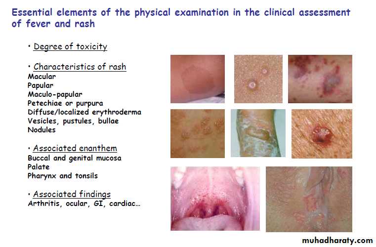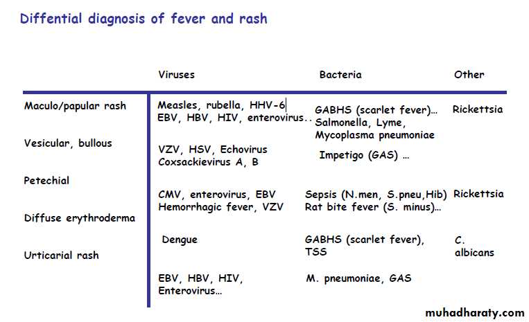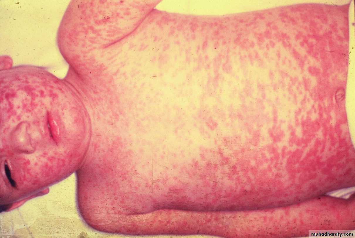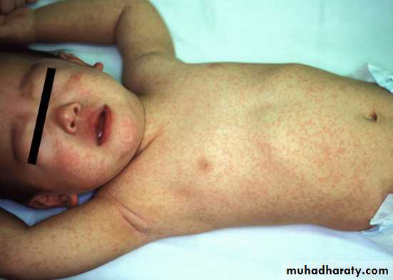 Maculopapular rash appears on the 4th day with the drop of fever. It starts on the trunk and rapidly spreads over the arms and neck, leaving the face minimally involved, and lasts only 24 hours.