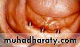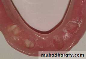 The resulting depressions in the mucosal aspect of the denture were lined with polyvinylsiloxane material and seated in the patient's mouth.