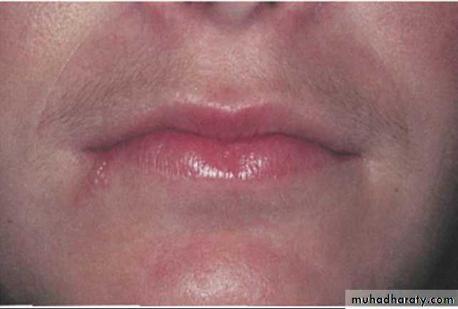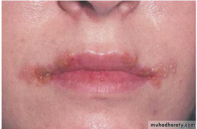 Wide spread bilateral fluid-filled vesicles of both upper & lower lips . Many of the vesicles have ruptured & formed crusts