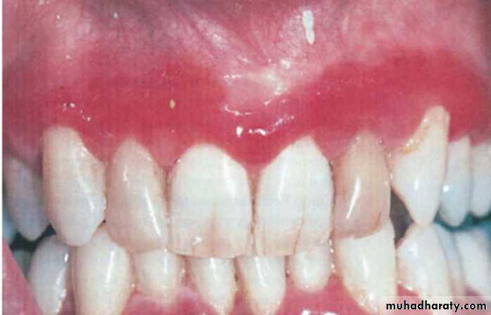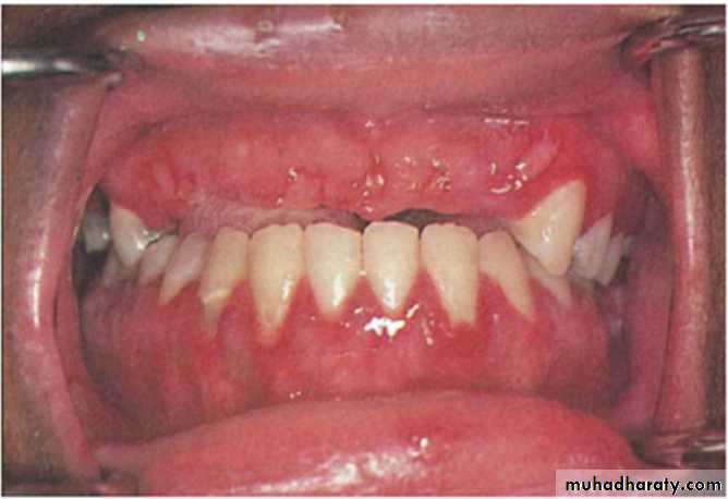 Multifactorial ulceration present on movable & bound mucosa . Note the intensely erythematous gingiva without significant plaque