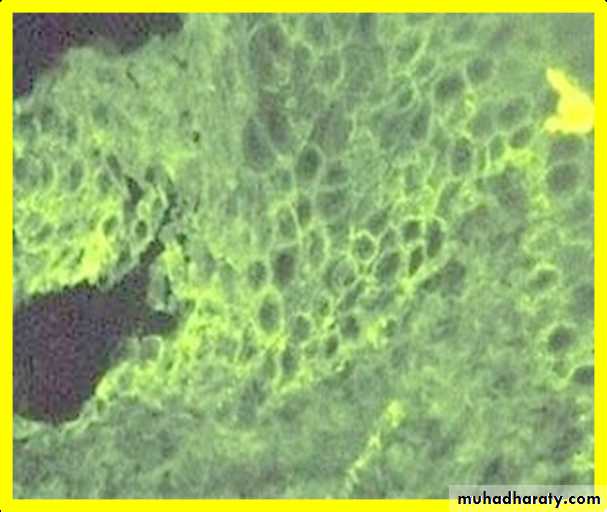 PV is diagnosed by [ Biopsy]done on intact vesicles and bullae less than 24 hours old; however, because these lesions are rare on the oral mucosa, the biopsy specimen should be taken from the advancing edge of the lesion, where areas of characteristic suprabasilar acantholysismay be observed by the pathologist. Specimens taken from the center of a denuded area are nonspecific histologically as well as clinically. Sometimes several biopsies are necessary before the correct diagnosis can be made. If the patient shows a positiveNikolsky sign, pressure can be placed on the mucosa to produce a new lesion; biopsy may be done on this fresh lesion . A second biopsy, to be studied by DIF, should be performed whenever pemphigus is included in the differential diagnosis. This study is best performed on a biopsy specimen that is obtained from clinically normal-appearing perilesionalmucosaor skin. In this technique for DIF, fluorescein-labeled antihumanimmunoglobulins are placed over the patient’s tissue specimen. In cases of PV, the technique will detect antibodies, usually IgG and complement, bound to the surface of the keratinocytes.Indirect immune fluorescent antibody tests :Have been described that are helpful in distinguishing pemphigus from pemphigoid and other chronic oral lesions and in following the progress of patients treated for pemphigus. In this technique, serum from a patient with bullous disease is placed over a prepared slide of an epidermal structure (usually monkey esophagus). The slide is then overlaid with fluorescein-tagged antihuman gamma globulin . Patients with pemphigus vulgaris have antikeratinocyte antibodies against intercellular substances that show up under a fluorescent microscope. The titer of the antibody has been directly related to the level of clinical disease.