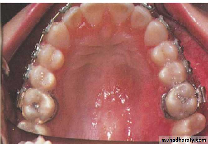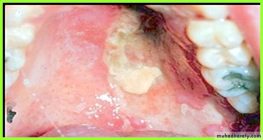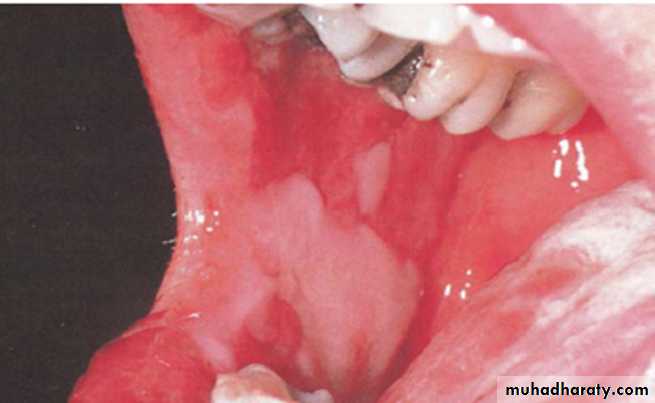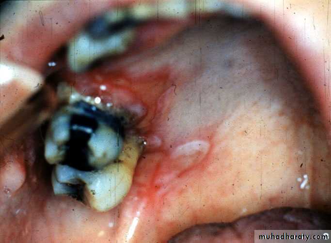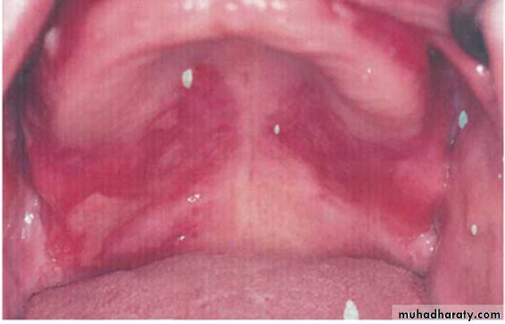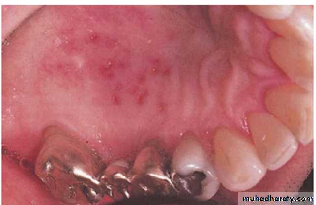 Palatal mucosa demonstrating numerous small ulceration that tend to cluster . Not the significant erythema & ulceration of the palatal gingiva