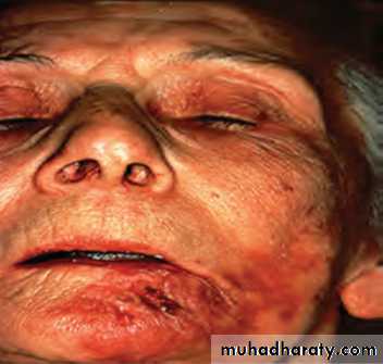 Primary herpes manifests as an acute illness with fever, irritability, headache & lymphadenopathy . Typically, there are initial symptoms of malaise associated with aches & a sore throat followed after (2-3) days by multiple small oral vesicles which rapidly breakdown to form well defined yellow base ulcer with a red margin . They may affect hard palate, tongue, lips & circum oral skin. In addition to the ulcerations, the whole mucosa is bright-red & painful with a marked edematous gingivitis . The lesions are self-limiting & usually disappear in ( 7-10) days .
