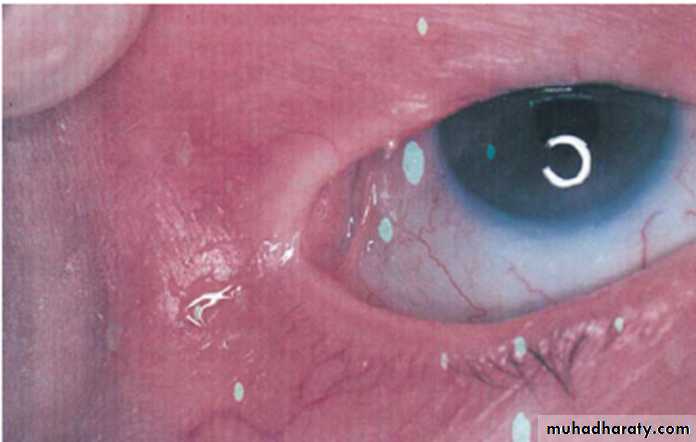 Clinical Manifestations:The subepithelial lesions of MMP may involve any mucosal surface, but they most frequently involve the oral mucosa .The conjunctiva is the second most common site of involvement and can lead to scarring and adhesions developing between the bulbar and palpebral conjunctiva called symblepharon. Corneal damage is common, and progressive scarring leads to blindness in close to 15% of patients. Lesions may also affect the genital mucosa, causing pain and sexual dysfunction. Laryngeal involvement causes pain, hoarseness, and difficulty breathing, whereas esophageal involvement may cause dysphagia, which can lead to debilitation and death in severe cases. Skin lesions, usually of the head and neck region, are present in 20 to 30% of patients .