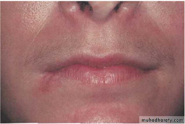 Early lesion characterized by Area of erythema of the right side of the lower lip that has been present for less than one day .Followed by Multiple fluid-filled vesicles and erythema of the right side of the lower lip . This picture depicts the same patient 24 hours after