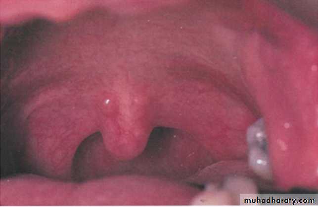 This is a variant of herpangina caused by coxsackievirus A10. The distribution of the lesions is the same as in herpangina, but yellow-white nodules appear that do not progress to vesicles or ulcers. The disease is self-limiting, and only supportive care is indicated. Symptomatic treatment directed toward antipyretic & topical anesthetic , also patient should be given proper hydration .Tow pink nodules immediately superior to the uvula with lateral adjacent erythema of the soft palat