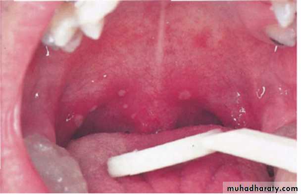Clinical diagnosis , lesion are summed in posterior part of the oral mucosa .The disease is usually mild and heals without treatment in 1 week. It is self-limiting & only supportive care is indicated .Multifocal area of ulceration & erythema of the soft palate . The patient report sore throat , fever , headache and vomiting