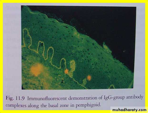Diagnosis: Patients with MMP must have a biopsy done for both routine and directimmune fluorescent study. Routine histopathology shows sub-basilar cleavage. Using the direct immune fluorescent technique, biopsy specimens taken from MMP patients demonstrate positive fluorescence for immunoglobulin and complement in the basement membrane zone in 50 to 80% of patients. The direct immune fluorescent technique is excellent for distinguishing MMP from pemphigus .Only 10% of MMP patients demonstrate positive indirect immunofluorescence for circulating antibasement membrane zone antibodies .