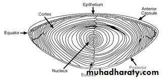-The lens grows in both anteroposterior and equatorial dimensions throughout life (this explains why angle- closure glaucoma occurs in old aged people, as the increasing volume of the lens may cause blockage or closure of the angle and impair drainage of fluid from anterior chamber to trabecular meshwork