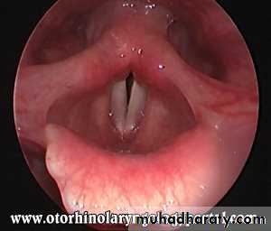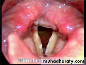 • 1. Hyperaemic in which the cords are injected or dull pink and stiffened in appearance. There' may be some loss of adduction due to myositis . Flecks of viscid mucus may lie on the cords and in the interarytenoid space. In severe cases the cords are deep red in colour and appear rounded and ‘sausage- like’