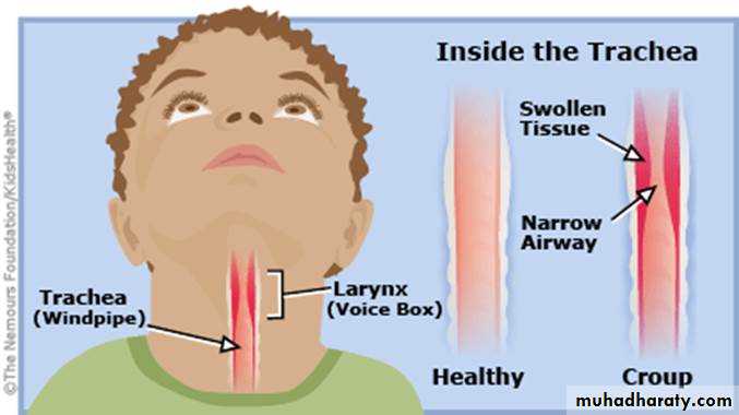 • Affects infants and young children. Causative organism .is usually parainfluenza virustype 1 or similar which shows seasonal and epidemic tendencies, Secondary bacterial infection by the third day of symptoms is common and makes the condition worse