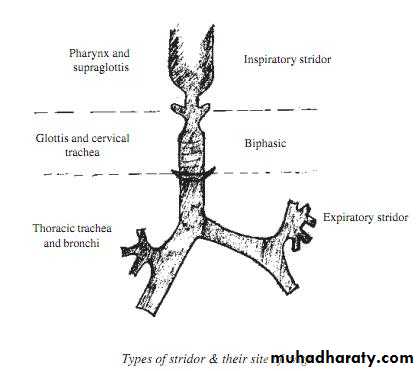 Inspiratory stridor suggests a laryngeal obstruction mainly supraglottis.Expiratory stridor implies tracheobronchial obstruction