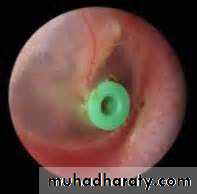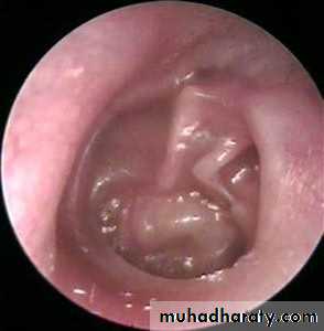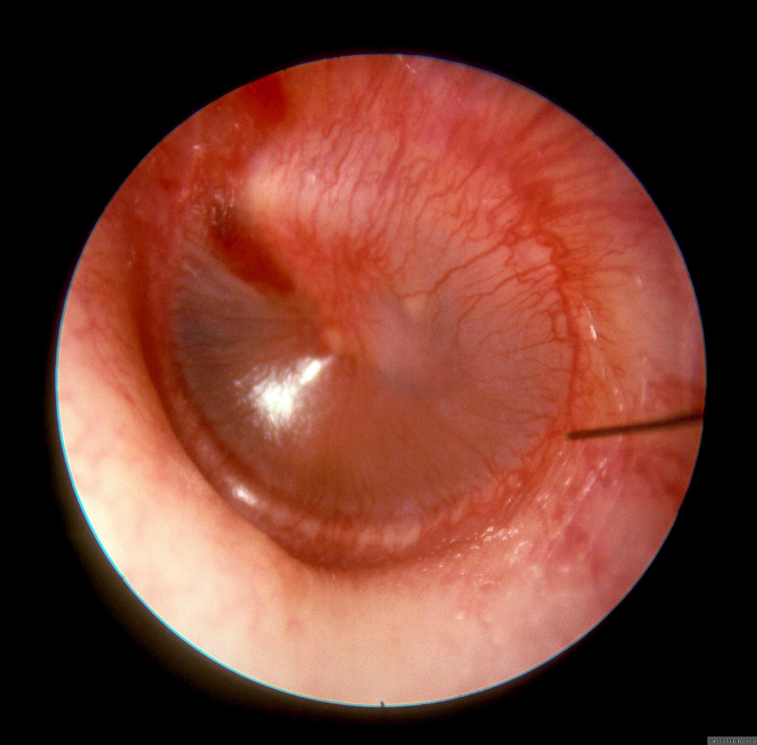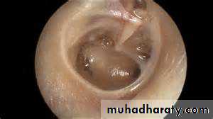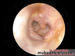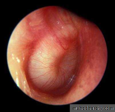 -- Before perforation: deafness increases, bubbling sounds are heared, otalgia and general symptoms especially seen in children and present as fever and malaise. On examination by otoscope: there are dilated vessels around the handle of the malleus and periphery of the tympanic membrane. This increases till the whole membrane is red, lusterless and bulging.