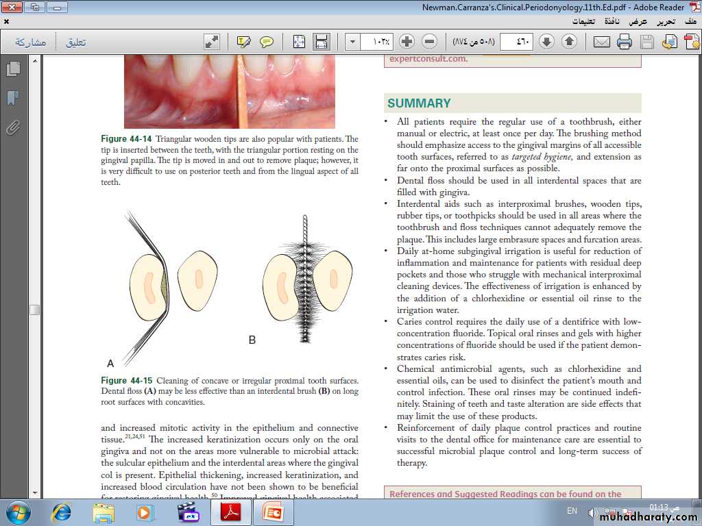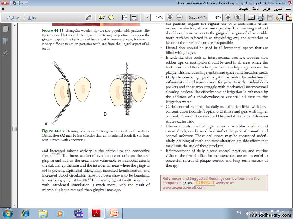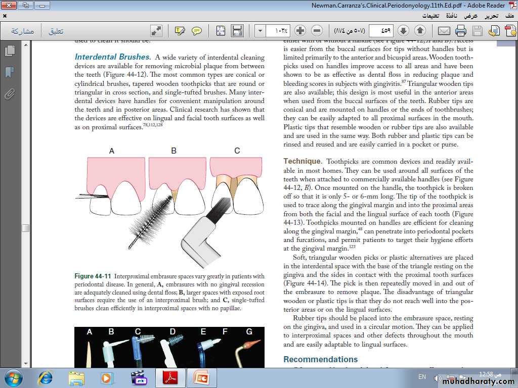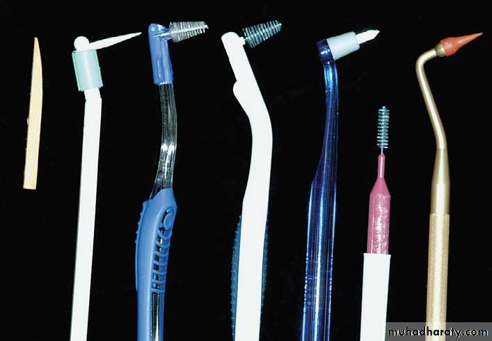 • Often a toothbrush and dental floss are not sufficient to clean interdental spaces adequately, so it is extremely important to find an interdental device that the patient likes and will use.• Many interdental cleaning aids are available for patients. The patient might need to try several devices before finding one that is acceptable and cleans adequately.