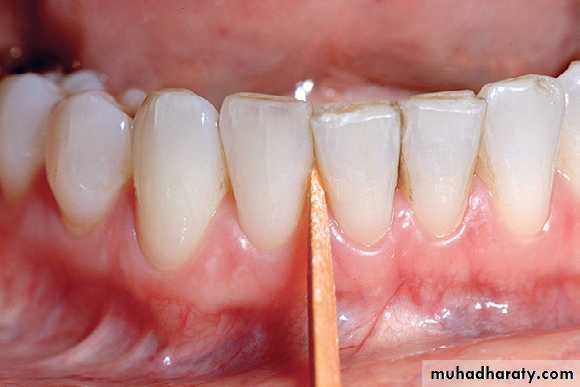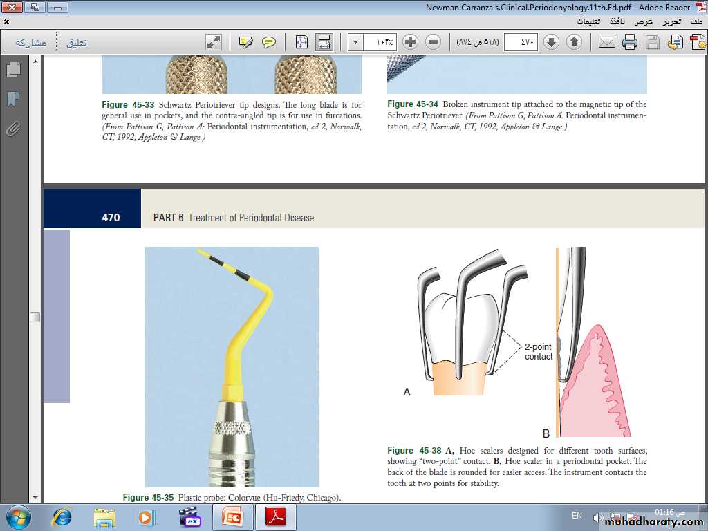 1. The blade is inserted to the base of the periodontal pocket so that it makes two-point contact with the tooth. This stabilizes the instrument and prevents nicking of the root.