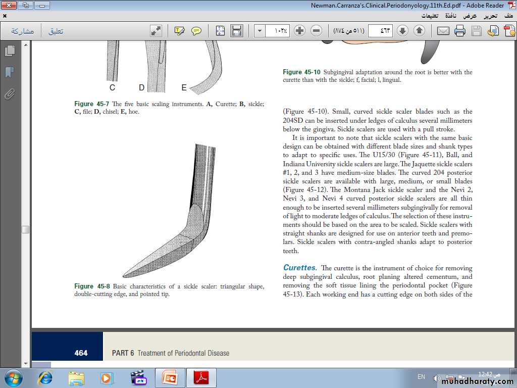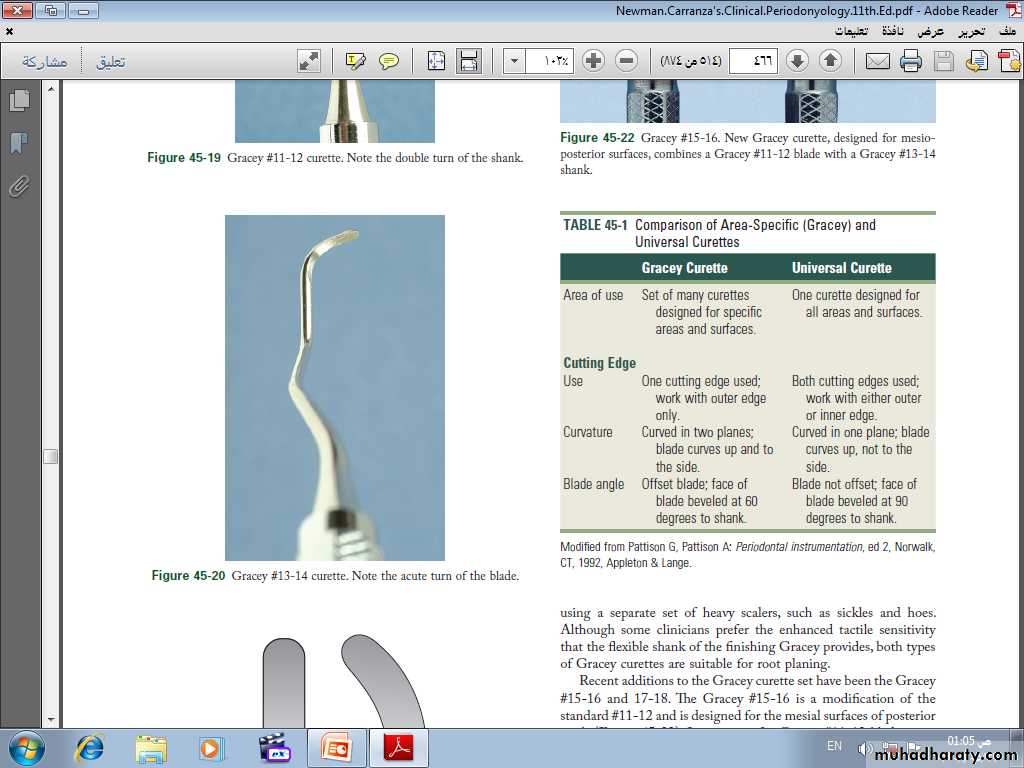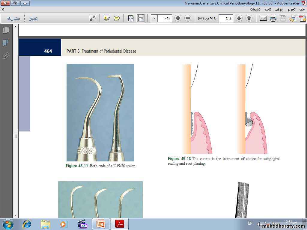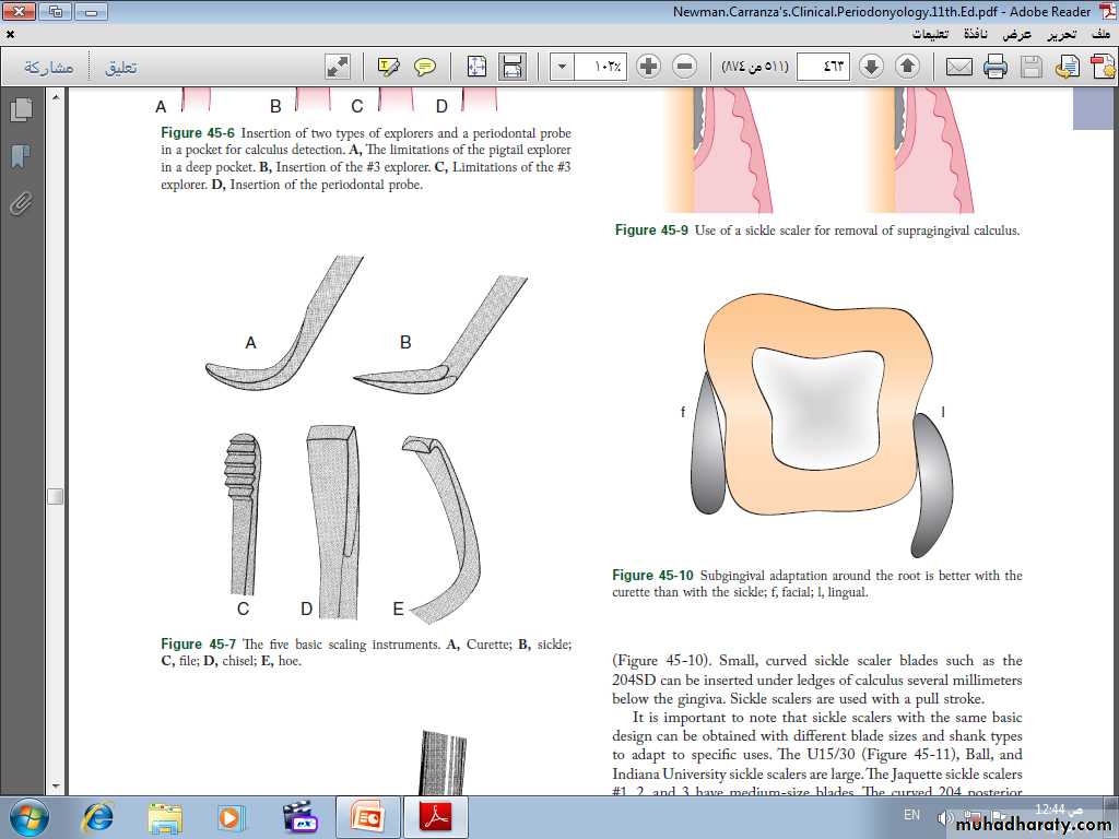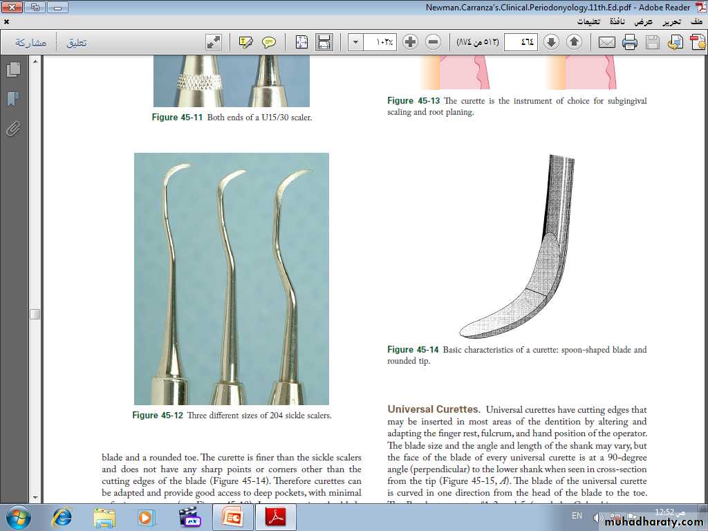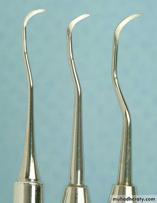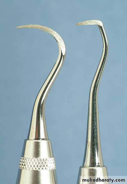 The curette is finer than the sickle scalers and does not have any sharp points or corners other than the cutting edges of the blade Therefore curettes can be adapted and provide good access to deep pockets, with minimal soft tissue trauma.