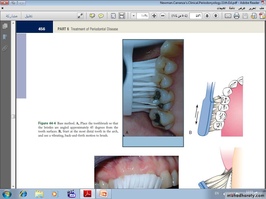 Patients with periodontal disease are most frequently taught a sulcular brushing technique using a vibratory motion to improve access in the gingival areas. This is referred to as “target hygiene.”The method most often recommended is the Bass technique because it emphasizes sulcular placement of bristles, adapting the bristle tips to the gingival margin to reach the supragingival plaque and accessing subgingival plaque to the extent possible