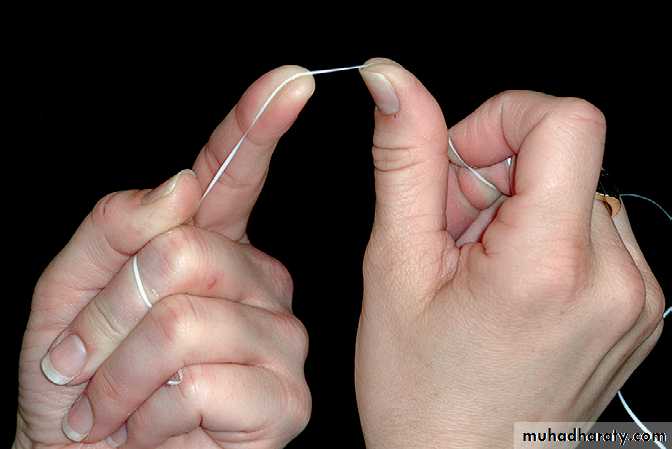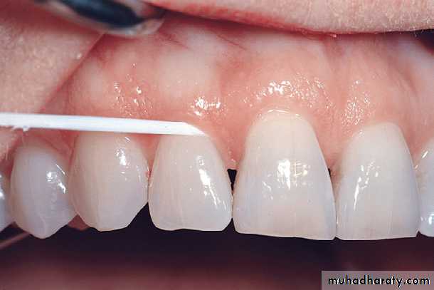)) Stretch the floss tightly between the thumb and forefinger, or between both forefingers, and pass it gently through each contact area with a firm back-and-forth motion.)) Once the floss is apical to the contact area between the teeth, wrap the floss around the proximal surface of one tooth, and slip it under the marginal gingiva. Move the floss firmly along the tooth up to the contact area and gently down into the sulcus again, repeating this up-and-down stroke two or three times. Then, move the floss across the interdental gingiva, and repeat the procedure on the proximal surface of the adjacent tooth.