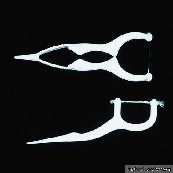 Flossing can be facilitated by using a floss holder. Floss holders are helpful for patients lacking manual dexterity and for caregivers assisting patients in cleaning their teeth. A floss holder should be rigid enough to keep the floss taut when penetrating into tight contact areas, and it should be simple to string with floss. The disadvantage is that floss tools are time-consuming because they must be rethreaded frequently when the floss shreds.