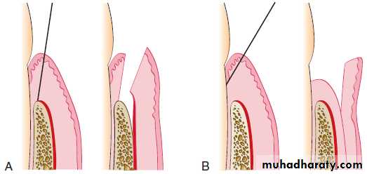 B, Diagram of the internal bevel incision to reflect a partial-thickness flap. Note that the incision ends on the root surface to preserve the periosteum on the bone.