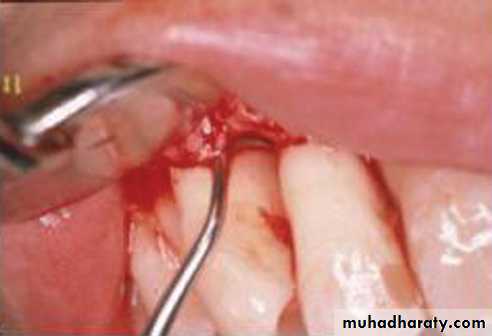 These three incisions allow the removal of the gingiva around the tooth (i.e., the pocket epithelium and the adjacent granulomatous tissue). A curette or a large scaler can be used for this purpose. After removal of the large pieces of tissue, the remaining connective tissue in the osseous lesion should be carefully curetted so that the entire root and the bone surface adjacent to the teeth can be observed.