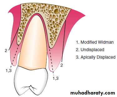 • nondisplaced flaps, when the flap is returned and sutured in its original position, or• displaced flaps, which are placed apically, coronally, or laterally to their original position. Both full-thickness and partial-thickness flaps can be displaced, but to do so, the attached gingiva must be totally separated from the underlying bone, thereby enabling the unattached portion of the gingiva to be movable. However, palatal flaps cannot be displaced because of the absence of unattached gingiva.