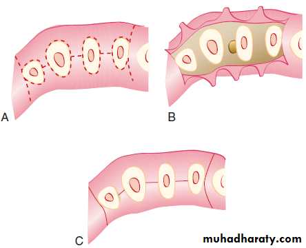 A, Design of incisions: sulcular incisions and vertical incisions are depicted by interrupted lines. B, The flap has been elevated, exposing the underlying bone. C, Tissue returned to its original position covers the entire interdental spaces.INCISIONS