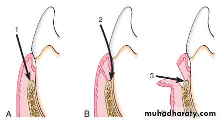 A, Diagram of the internal bevel incision to reflect a full-thickness (mucoperiosteal) flap. Note that the incision ends on the bone to allow for the reflection of the entire flap.