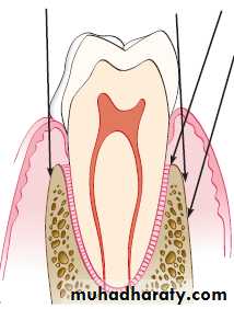Horizontal incisions are directed along the margin of the gingiva in a mesial or a distal direction. Two types of horizontal incisions have been recommended: the internal bevel incision, which starts at a distance from the gingival margin and is aimed at the bone crest, and the crevicular incision, which starts at the bottom of the pocket and is directed to the bone margin. In addition, the interdental incision is performed after the flap is elevated.The internal bevel incision is basic to most periodontal flap procedures. It is the incision from which the flap is reflected to expose the underlying bone and root. The internal bevel incision accomplishes three important objectives: