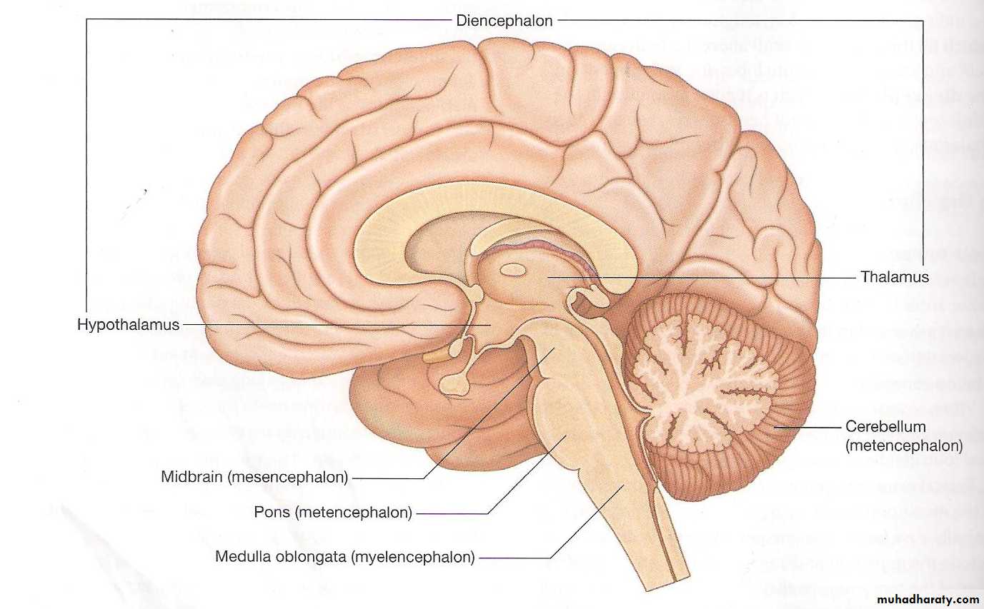 The parts of the brain are: -Fore brain: - including the cerebrum (2 hemispheres) & Diencephalon (thalamus & hypothalamus).