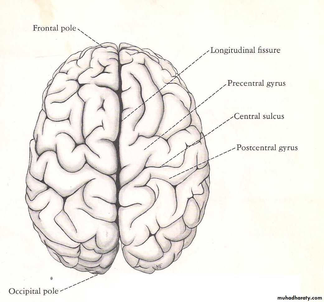 - consist of two hemispheres separated from each other by the median longitudinal cerebral fissure (which contains the falx cerebri), at the bottom of the fissure, the two hemisphere are connected together by what is called the corpus callosum (a kind of commissural fibers), each hemisphere consist of four lobes: - frontal, parietal, temporal & occipital, with three poles: - a frontal, temporal & occipital poles. Each hemisphere extends from the frontal bone anteriorly as far as the internal occipital protuberance posteriorly. Where the occipital lobe is separated from cerebellum by the tentorium cerebelli.