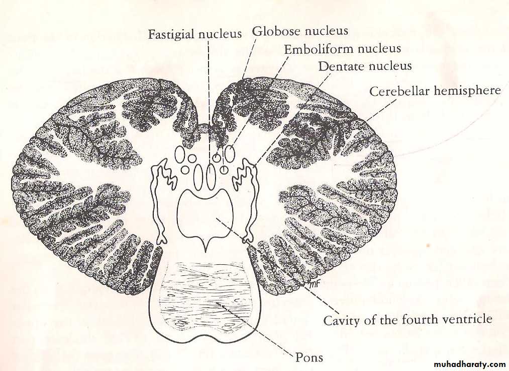 The medulla of cerebellum contains four intracerebellar nuclei arranged from lateral to medial as dentate, emboliform, globose and fastegial nuclei embedded within the white mater of cerebellum.