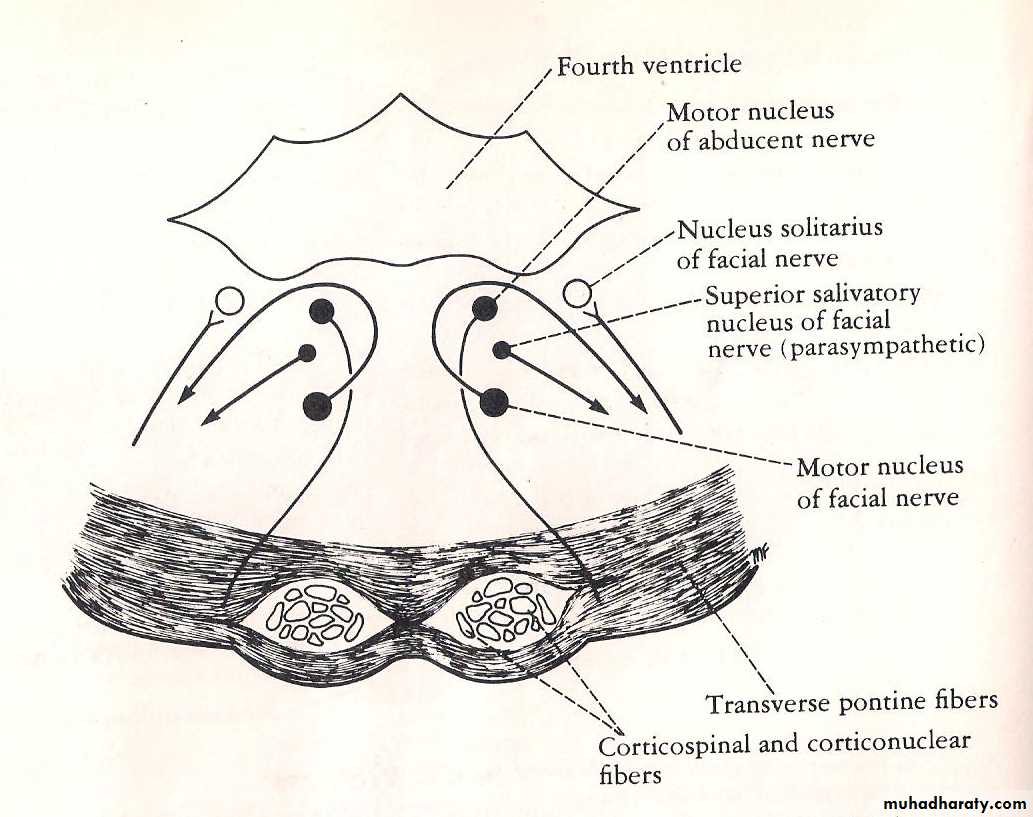 • 3- Nuclei of facial nerve (3 in number): - One motor, one parasympathetic (superior salivary) both of these nuclei lie in the Pons, while the 3rd nucleus (I.e. sensory for taste, the solitarius) lies in the medulla oblongata. Superior salivary nucleus gives fibers distributed via chorda tympanic (sublingual & submandibular) & greater superficial petrosal (to lacrimal & nasal glands).