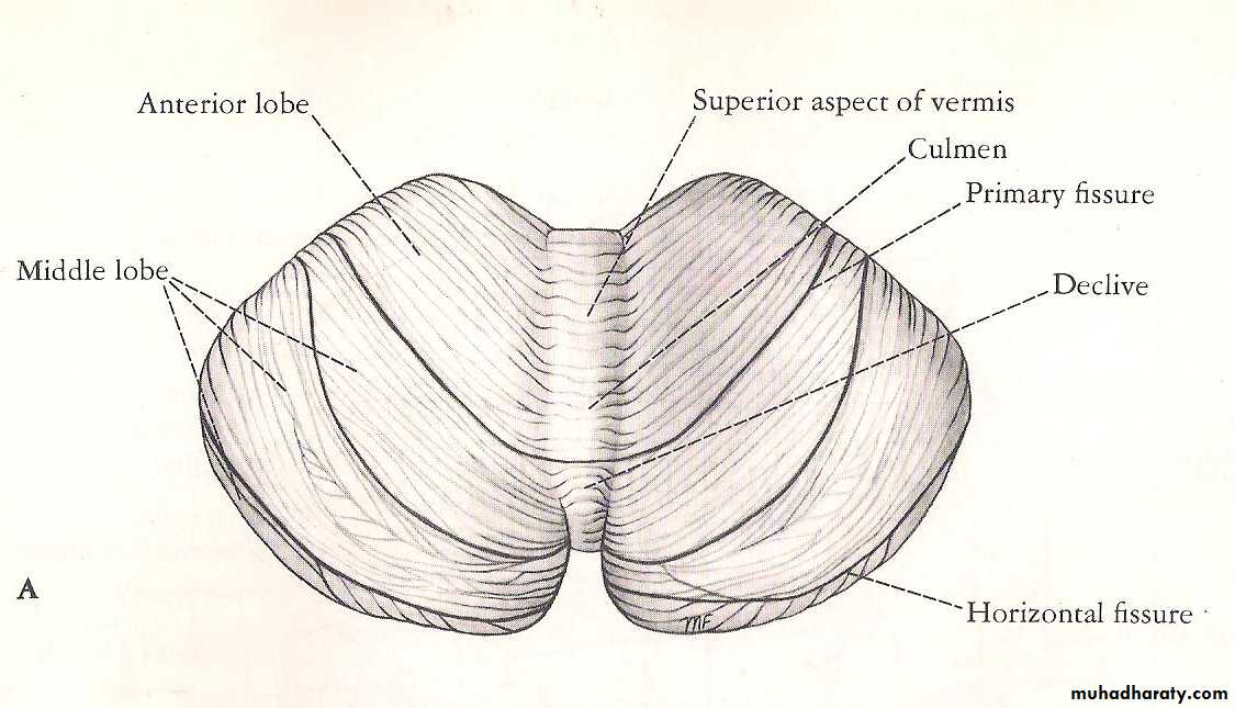 • Anterior lobe: - in front of the fissure prima and its part that extending above the superior medullary velum is called the lingula.