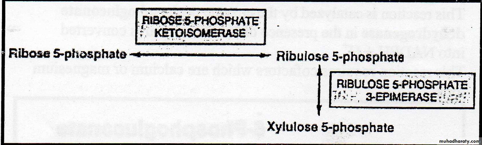 A . Ribulose 5 phosphate 3 epimerase that alters the configuration about C3,forming another ketopentose known as xylulose 5 phosphateB . Ribulose 5 phosphate ketoisomerase that converts Ribulose 5 phosphate which is a keto sugar to the corresponding aldosugar known as ribose 5 phosphate which is the precursor of ribose required for nucleotides and nucleic acid synthesis.