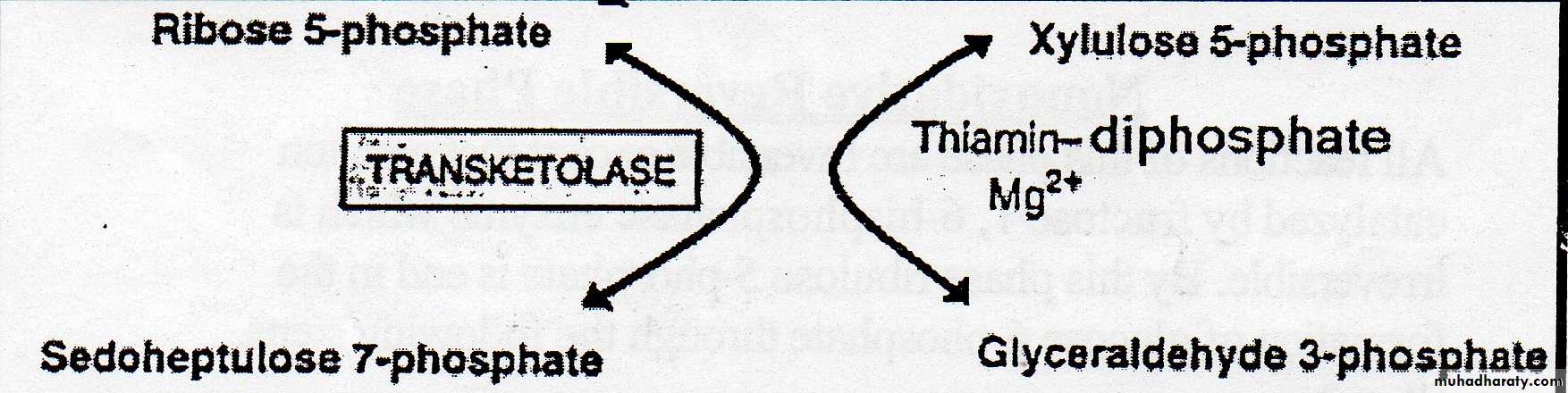 Therefore, transketolase catalyzes the transfer of two carbon from the five carbon ketose (xylulose 5 phosphate) to the five carbon aldose(ribose 5 phosphate) ,producing seven carbon ketose (sedoheptulose 7 phosphate) and three carbon aldose (glyceraldehyde 3 phosphate)