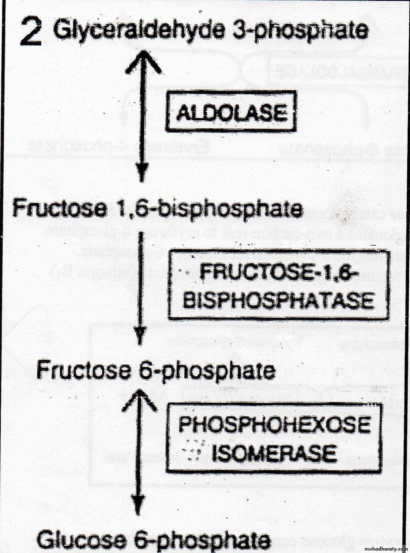 2.The conversion of fructose 1 ,6 bisphosphate to fructose 6 phosphate this is catalyzed by fructose 1,6 bisphosphatase .