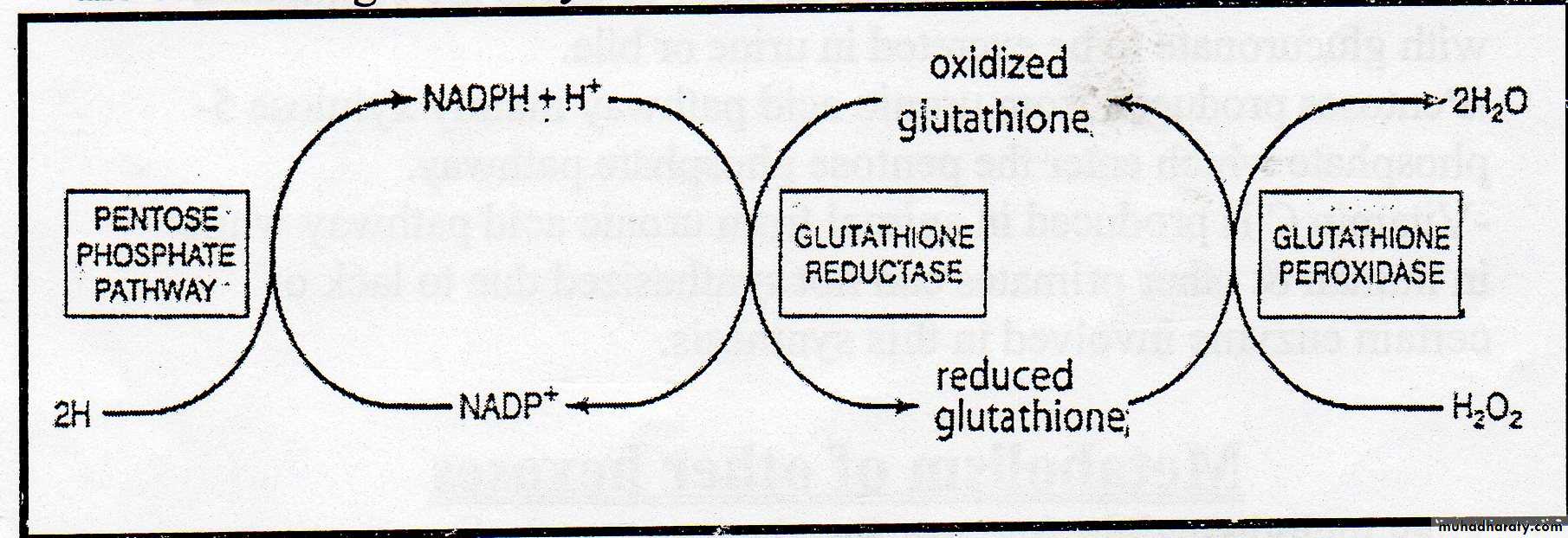Glucose 6 phosphate dehydrogenase deficiency (G6PD Deficiency) or Favism :it is the main clinical aspect of pentose phosphate pathway in which there is genetic deficiency of glucose 6 phosphate dehydrogenase enzyme with consequent impairment of the generation of NADPH+H⁺, this disease is common in population of Mediterranean and afro Caribbean origin.The defect is manifested as red cell hemolysis (hemolytic anemia) when susceptible individual is subjected to an oxidant that contain H₂O₂ because glutathione peroxidase which removes H₂O₂ is dependent upon a supply of NADPH, which in RBC can be formed only via the pentose phosphate shunt.