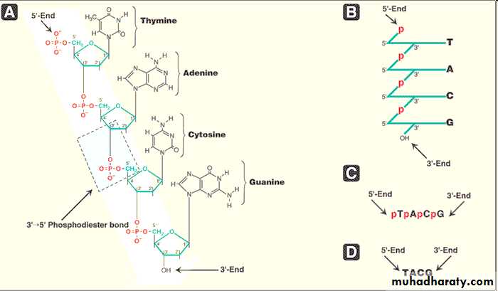 DNA is a polymer of deoxyribonucleoside monophosphates (or deoxyribonucleotides) covalently linked by 3′→5′–phosphodiester bonds.